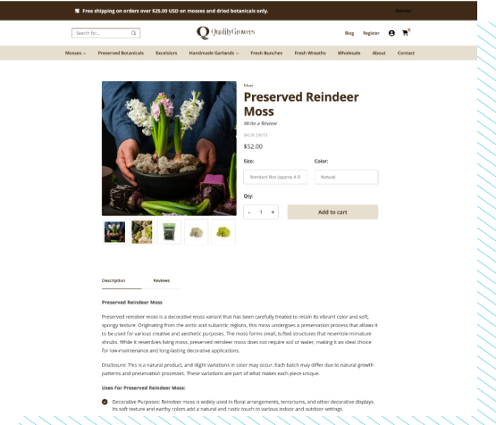 The user interface for Quality Growers was designed to highlight the natural beauty and texture of their products while keeping the shopping experience clean and distraction-free. Visual elements, typography, and spacing were carefully chosen to let mosses and garlands take center stage without overwhelming the user.